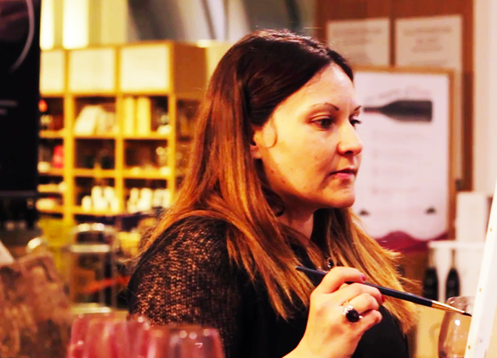 “Eu moro no sul da Itália em Porto Cesareo (no Lecce, Puglia) e me aproximei do mundo do vinho graças ao Amor: é que eu estava noiva de um homem que lida com vinho, tem uma Enoteca e faz distribuição e por causa dele comecei a conhecer esse mundo. Aos poucos, depois de provar muitos vinhos, garrafa após garrafa, pensei em usá-lo para pintar. Não estudei pintura e sim Odontologia, mas a pintura tradicional sempre fez parte da minha vida porque eu estudei a arte e sua relação com as emoções.”