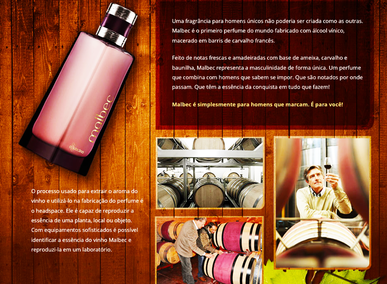 Lançado em 2003, Malbec (acima) foi anunciado como “o primeiro perfume do mundo fabricado com álcool vínico, macerado em barris de carvalho francês; feito de notas frescas e amadeiradas com base de ameixa, carvalho e baunilha, Malbec representa a masculinidade de forma única.” Veja abaixo. Ainda segundo o Boticário, “O processo usado para extrair o aroma do vinho permitiu identificar a essência do vinho Malbec e reproduzi-la em um laboratório.”