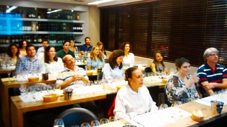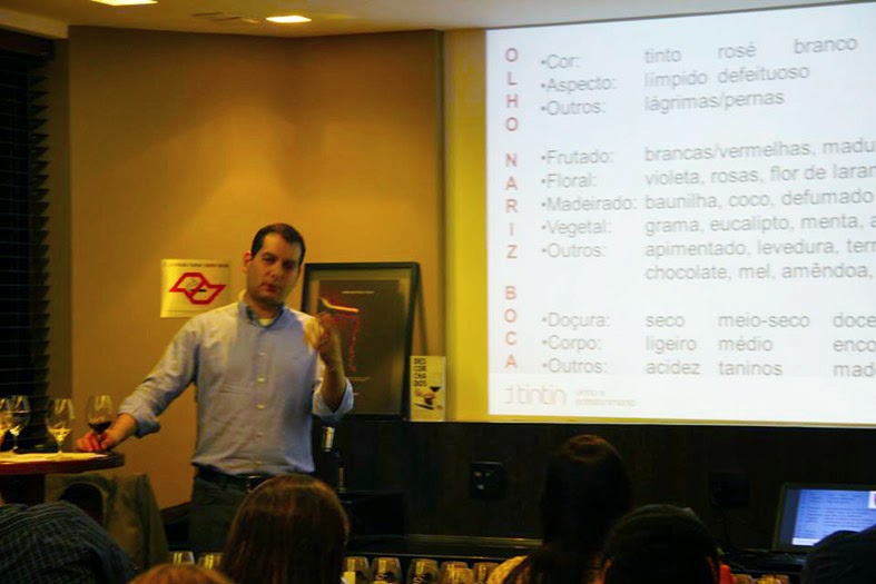 Mas isso tudo foi só o aquecimento, porque então começaram as degustações às cegas – com e sem comida (veja o quadro de pontuação abaixo), seguindo o roteiro de avaliação pelos sentidos: os aspectos de cor, aroma e sabor, na foto abaixo sendo relembrado pelo sommelier João.