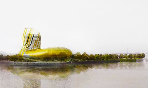 Será um complexo arquitetônico de madeira e vidro (materiais importantes na atividade vinícola) com 55 metros de altura e um design similar a um decantador gigante, formando uma espiral curva que vai permitir visualizar as margens do rio Garonne (veja acima e abaixo, imagens aplicando a maquete na futura localização).
