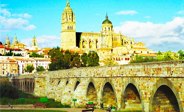 A cidade de Salamanca surgiu cerca de 2.700 anos atrás, durante a Primeira Idade do Ferro e desde então o lugar foi testemunha da passagem de váceos, vetões, romanos, visigodos e muçulmanos. É uma das cidades espanholas mais ricas em monumentos da Idade Média, Renascimento e das épocas clássica e barroca. Abaixo, uma ponte romana da cidade e sua famosa Catedral. Um brinde aos romanos e espanhóis.