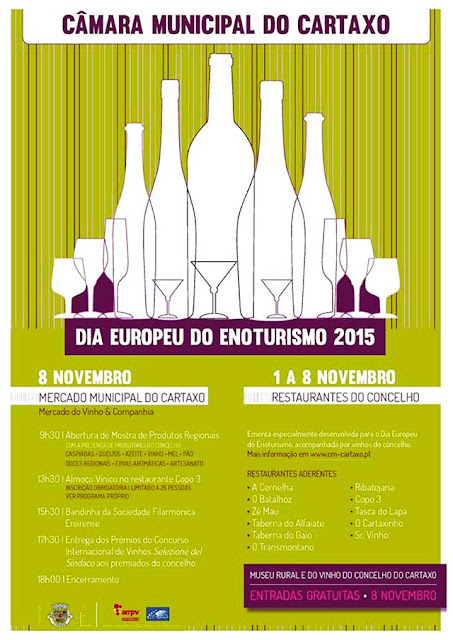 Cartaxo está na Rota dos Vinhos do Tejo (DOC Ribatejo) e tem várias festas ligadas a agricultura e ao vinho, além de participar ativamente do Dia do Enoturismo, em novembro, como mostra o cartaz abaixo.