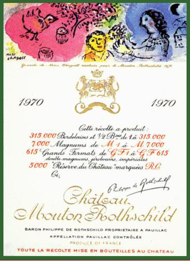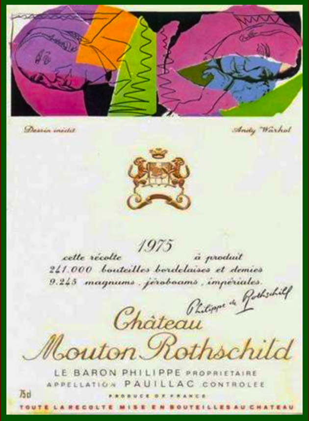 Para fazer isso Philippe de Rothschild encomendou o trabalho para o então famoso designer de cartazes Jean Carluque ao criar um rótulo para os vinhos do Château Mouton Rothschild, mudou a história dos vinhos para sempre. E assim foi feito, entre 1924 e meados dos anos 1940. Abaixo, rótulos criados por Marc Chagall em 1970 e pelo artista pop norte-americano Andy Warhol em 1975.