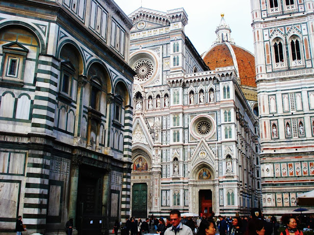 A fachada (abaixo) foi concluída somente em 1887. O Duomo foi construído no lugar da antiga catedral dedicada a Santa Reparata que funcionou durante nove séculos até ser demolida completamente em 1375. A ironia é que, depois de pronto, o Duomo se tornou uma clara demonstração do poder e da riqueza de Florença.