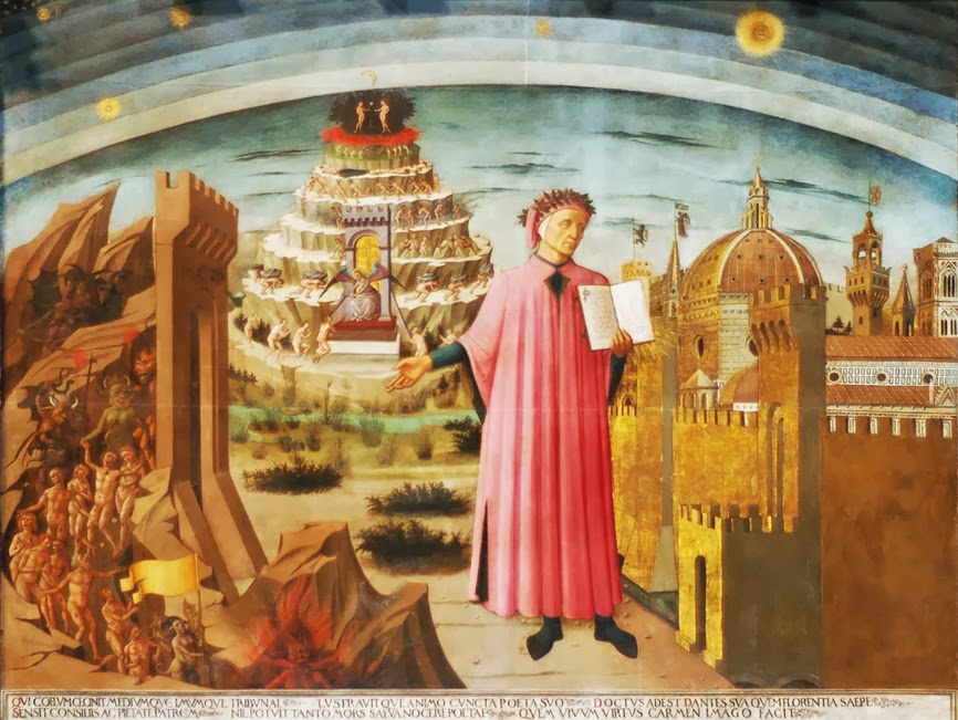 Dentro da Basílica podem ser encontrados vitrais com imagens de santos do Velho e Novo Testamento, monumentos, estátuas, bustos e telas – entre as quais a pintura “Dante e a Divida Comédia”, de Domenico di Michelino e afrescos de FraFilippo Lippi (veja abaixo), um relógio de Paollo Ucello com hora itálica (que começa com o nascer do sol) e relevos, cerâmicas e portas de bronze internas de Luca della Robbia. Um brinde a isso, caro leitor!