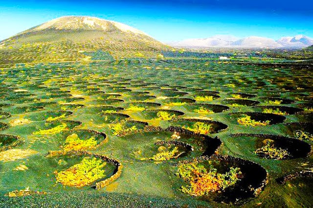 Ao longo dos últimos 10 anos o turismo relacionado ao vinho criou mais de 50.000 postos de trabalho em todas as regiões da Espanha, especialmente nas 20 rotas de vinho certificadas pela Acevin, o que vem ajudando bastante no aquecimento da economia e na redução das taxas de desemprego, que ainda são altas. Abaixo, a criativa produção de uvas em La Geria, nas Ilhas Canárias.