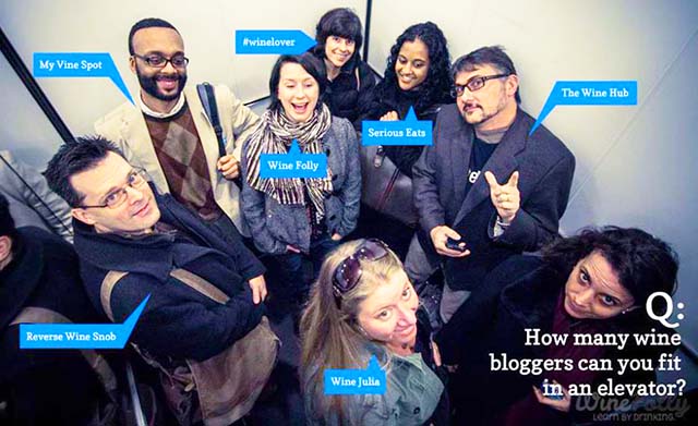 The meetings (#winelover hangouts) allow participants – people who only know each other by Facebook – can accomplish the main goal of the group: unite the friendship of people around the world who share a passion for wine. And as the group is large, with over 20,100members, the encounters are frequent and in different countries. Sometimes just eightwinelovers who have blogs about wine can represent thousands of readers in an elevator, as this funny picture shows below.