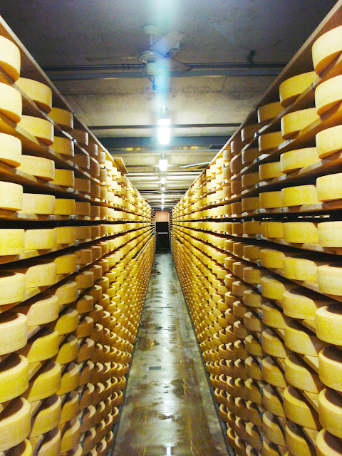 Os queijos mais maduros apresentam até um certa sensação de que têm pequenos grãos de areia (desculpe) no meio da massa. A casca é dura, seca e de cor castanho-escuro, tipo assim, ferruginosa, e o sabor no primeiro contato com a boca é levemente frutado, mas permanece na boca com um leve sabor de nozes. Enfim, uma delícia. Mas para chegar a esta delícia, eles ficam descansando (amadurecendo) em câmaras com temperatura controlada, como na foto abaixo.