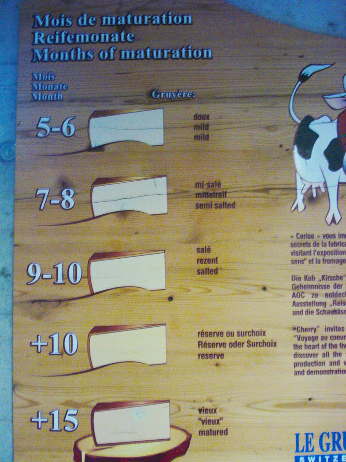 Pois este queijo é fabricado especialmente em Gruyères, minúsculo vilarejo de fala predominante francesa no Cantão de Friburgo, com cerca de 1.700 moradores – e também nos cantões de Vaud, Neuchâttel, Jura e Berna. O Gruyère é um queijo duro, com sabor forte (especialmente os mais maduros, que podem descansar durante até 18 meses), com textura granulosa, densa e compacta, podendo ser mais cremosos nos produtos mais jovens, com até 8 meses de descanso. Veja a tabela de amadurecimento na foto abaixo.