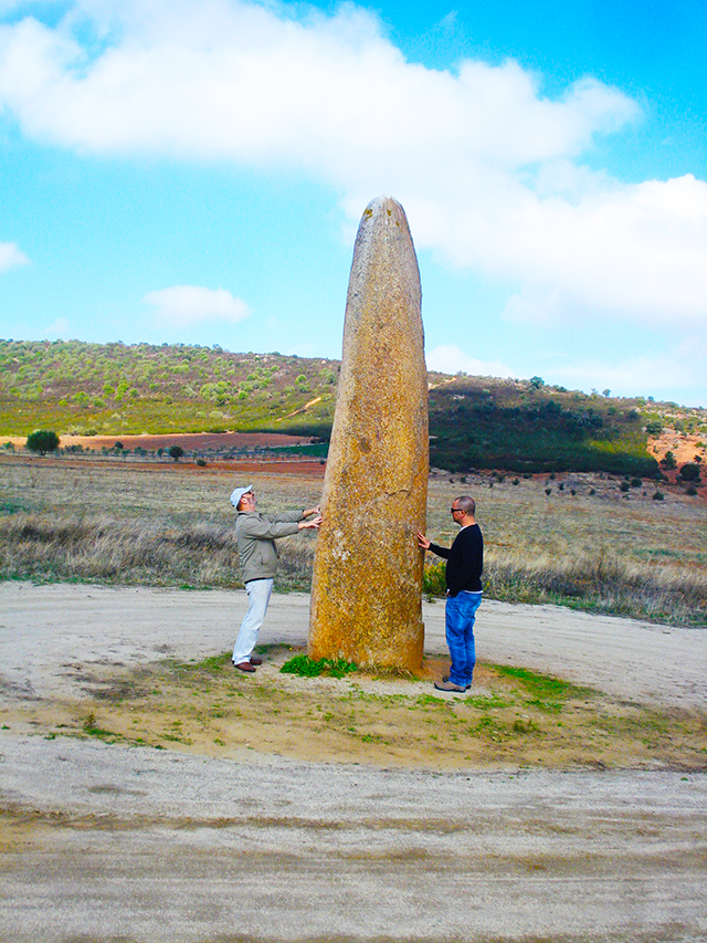 Como tem acesso pelo mar (onde estão charmosas aldeias como Sines e Porto Covo destacadas pelo jornal britânico The Guardian em 2014 como as melhores da Europa) e é plano, o Alentejo vem atraindo moradores e visitantes há muito tempo – mais específicamente há mais de 7.000 anos. Nesta região estão muitos monumentos megalíticos: já foram catalogados mais de 100 menires isolados, cerca de 800 antas (casas de pedra) e perto de 450 povoações megalíticas, só no concelho de Évora. Esta riqueza da pré-história no Alentejo é das mais importantes da Península Ibérica, porque alguns datam de até 5.500 anos AC. Na foto acima está o Cromeleque dos Almendres e abaixo este repórter examinando um menir com o guia.