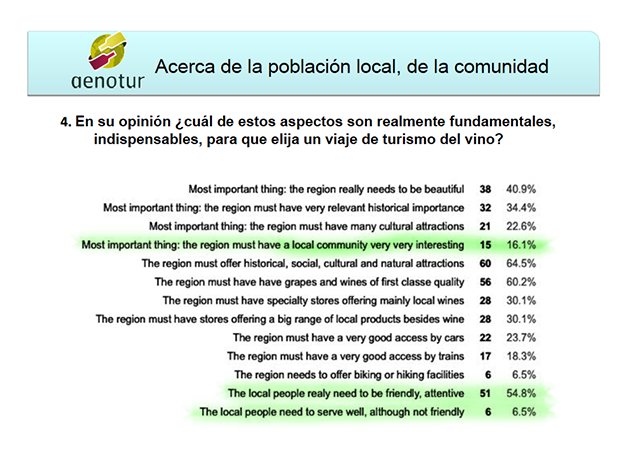 Entonces le pregunté en la encuesta “¿En su opinión cuál de estos aspectosson realmente fundamental, indispensable, para que elija un viaje de turismo del vino?” Y les dio opción múltiple, con muchos grupos de aspectos. Usted puede verlas cosas más importantes en las próximasimágenes.