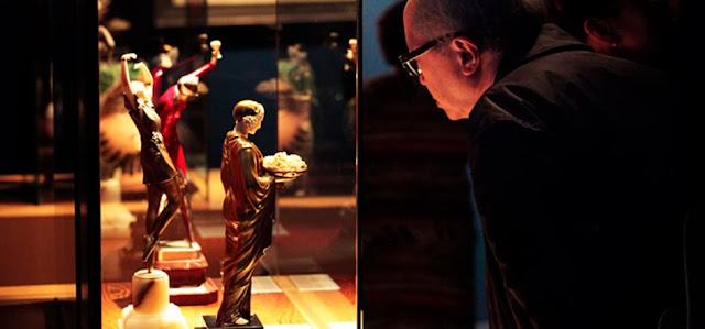 Agora vamos entrar no prédio. No piso térreo estão a recepção, um café, um restaurante que serve vinhos Rioja tradicionais e contemporâneos, uma loja de vinhos e uma sala para exposições temporárias ou eventos como o lançamento de livros (abaixo Santiago Vivanco no lançamento de um livro sobre o vinho e no cinema) ou desfile de modas (também abaixo) e o acesso para as salas de exposição permanente.