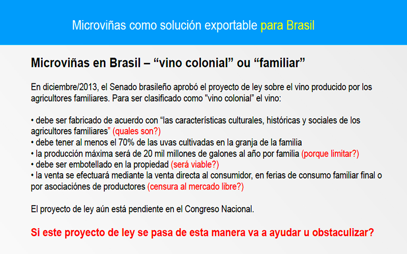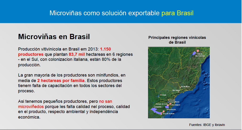 Na palestra fiz uma avaliação dos impactos positivos do processo produtivo das “microvinhas” (veja o resumo no slide que abaixo) e avaliei algumas condições para que pudéssemos ter no Brasil minifúndios produzindo vinhos de alta qualidade, de maneira sustentável – e dando lucro. Infelizmente não pude apresentar casos brasileiros reais porque a assessoria de imprensa do Instituto Brasileiro do Vinho (Ibravin) não atendeu o pedido de ajuda do In Vino Viajas mesmo sabendo que seria para divulgação internacional; e por outro lado a ajuda das atenciosas jornalistas da empresa Conceito.Com, de Bento Gonçalves, que faz assessoria de imprensa para várias empresas, não chegou a tempo.