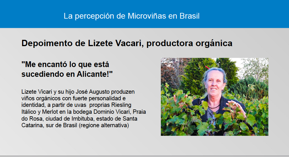 Como este assunto é complexo e respeito o limite de minha competência, pedi e recebi muita ajuda de muitos profissionais do ramo, a quem agradeço. Raphael Allemand, de EOC International e InterBeaujolais no Brasil me ajudou com exemplos de microvinhedos franceses; Andréa Junqueira e Lidia Hartlo, de Etc Vinos, do Brasil forneceram dicas da Alemanha e Áustria; peguei exemplos de uma palestra do Prof. David Bernardo López Lluch, da Escuela Politécnica Superior de Orihuela, de Valencia, que encontrei na internet. Pedi depoimentos exclusivos para Lizete Vicari, produtora brasileira de eco-micro-vinhos (foto abaixo); Jefferson Sancineto Nunes, enólogo e engenheiro que é o “pai” do vinho biodinâmico no Brasil; Sonia Denicol, blogueira, sommeliére e professora; e Juan Cascant, diretor do projeto Microvinhas e um dos criadores deste movimento todo que agora está atravessando o Oceano Atlântico desde Valencia e – acho eu – ancorando em território brasileiro.