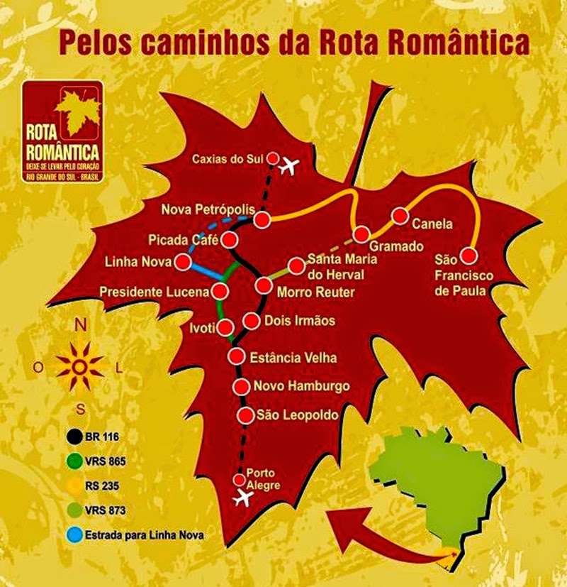 A Rota Romântica brasileira foi inspirada na Romantische Strasse da Alemanha, que recebe 24 milhões de visitantes diários e inclui entre suas atrações o famoso Castelo de Neuschwanstein – aquele que teria inspirado Walt Disney – a maior atração turística da Alemanha. No Brasil não temos castelos assim, mas no outono as imagens das rodovias nas duas regiões são tão parecidas, que as vezes se confundem – veja acima e abaixo fotos do roteiro gaúcho.