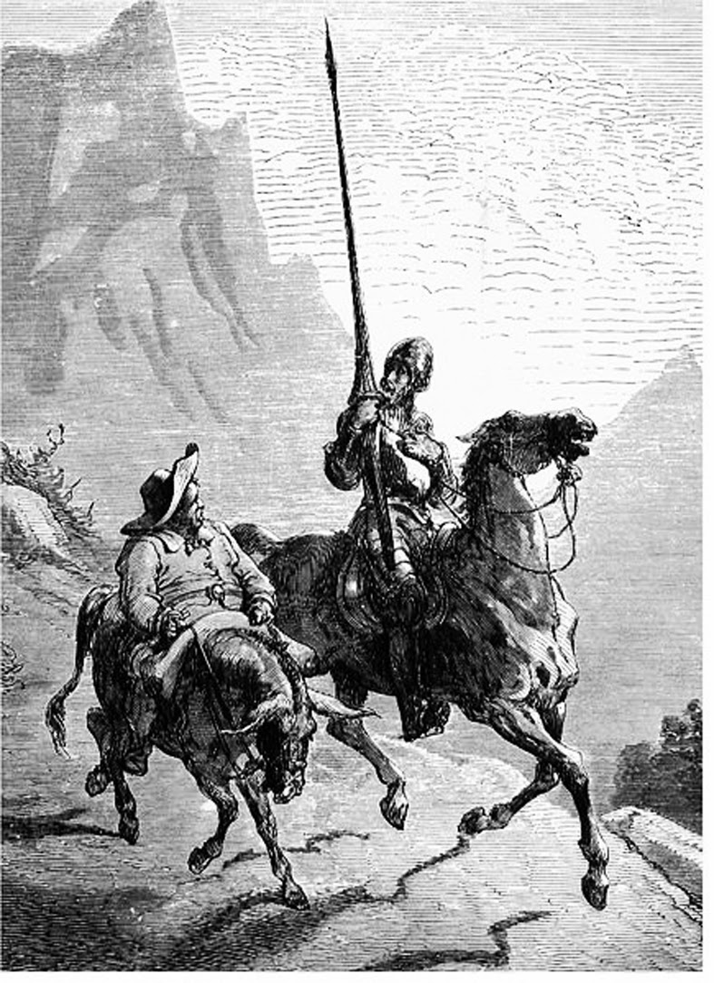 Como sou seu amigo, vou sugerir uma coisa: se um dia você tiver a oportunidade de visitar Castilla-La Mancha, liberte o Don Quixote que tem dentro de você. Castilla-La Mancha – a terra de Don Quixote e seu escudeiro Sancho Pança, abaixo – parece que só revela integralmente seu imenso patrimônio cultural, riqueza popular e paisagens se você tiver a coragem de passar um tempinho meio “sem rumo”, se você for um quixotesco sonhador.