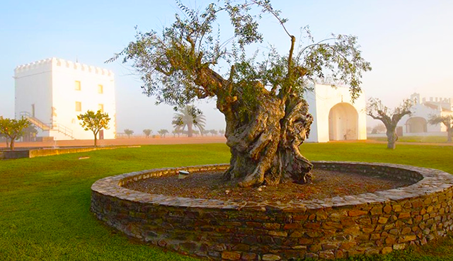 A Herdade do Esporão é uma empresa que se reinventa há mais de 700 anos. Fundada no ano de 1267 – isso mesmo, no século XIII – a Herdade do Esporão preserva três importantes monumentos históricos na propriedade como testemunhas desta longa dedicação à atividade vitivinicola: o Arco do Esporão, a Ermida de Nossa Senhora dos Remédios e a Torre do Esporão, construída em torno de 1490 e que aparece no logotipo da empresa (veja na foto abaixo, onde eu estou com o enólogo Rui Flores). Na foto acima, parte destes monumentos arquitetônicos e uma oliveira centenária, um verdadeiro monumento ambiental.