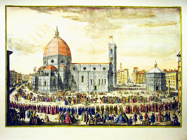 Segundo consta, este tipo e promoção – que a partir do século XX passou a ser uma “ferramenta de marketing” – já era feita há centenas de anos em Florença. Nesta ilustração do século XV abaixo a fila é em torno do Duomo para ir a um evento religioso, mas bem que poderíamos dizer que é para degustar vinhos, não? Até porque reunia sacerdotes e monges, que são os grandes incentivadores de um bom vinhozinho…